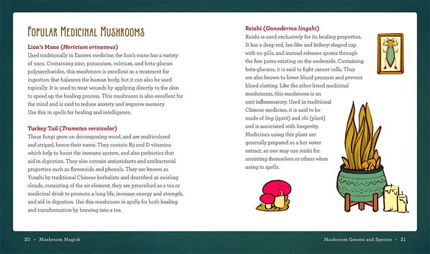 Mushrooms—as a decorative element, as a signifier of the mystery of the forest, and as an adorable emblem of witchy cottagecore dreams—have proliferated in the collective consciousness as of late. Mushroom Magick is a whimsical collection of mushroom facts and fables divided into three sections: first, profiles of 22 well-known mushrooms include information on biology and common uses as well as a rundown of their energetic properties and suggestions for incorporating them into spellwork. Section two provides a world-spanning collection of mushroom myths and fables. The final section includes spells and rituals that you can perform with common mushrooms such as creminis, shiitakes, and portobellos—carved candles, teas, and even some yummy meals can improve your love life or super-charge your good fortune