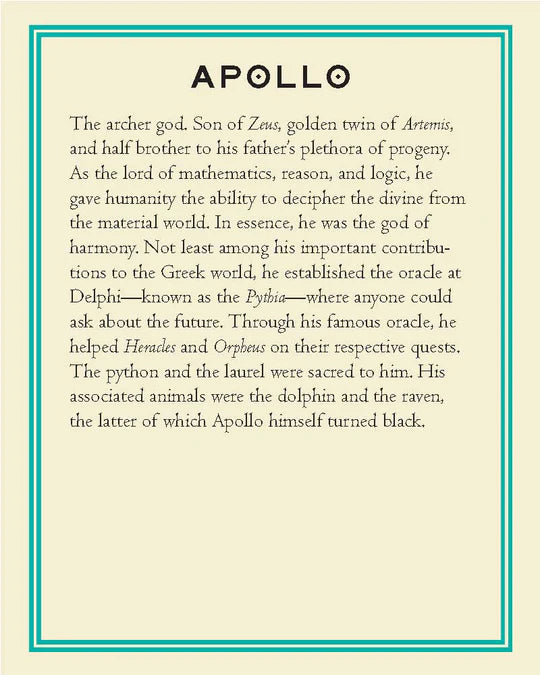 Based on Stephen Fry's best-selling Mythos series, this beautifully illustrated deck offers inspiration from the gods, heroes, and monsters of Greek mythology. This deluxe deck features all your favorite mythological figures: Athena, Circe, Hades, Heracles, and many more. You’ll also discover lesser-known but no less fascinating figures like Arachne, the weaver who dared to challenge a goddess, and Chiron, the centaur who tutored Achilles. Each card features one mortal, immortal, or monster, with an illustrated portrait on one side and an enlightening and entertaining description on the other. Use the cards as a study tool or an oracle (of Delphi) deck.