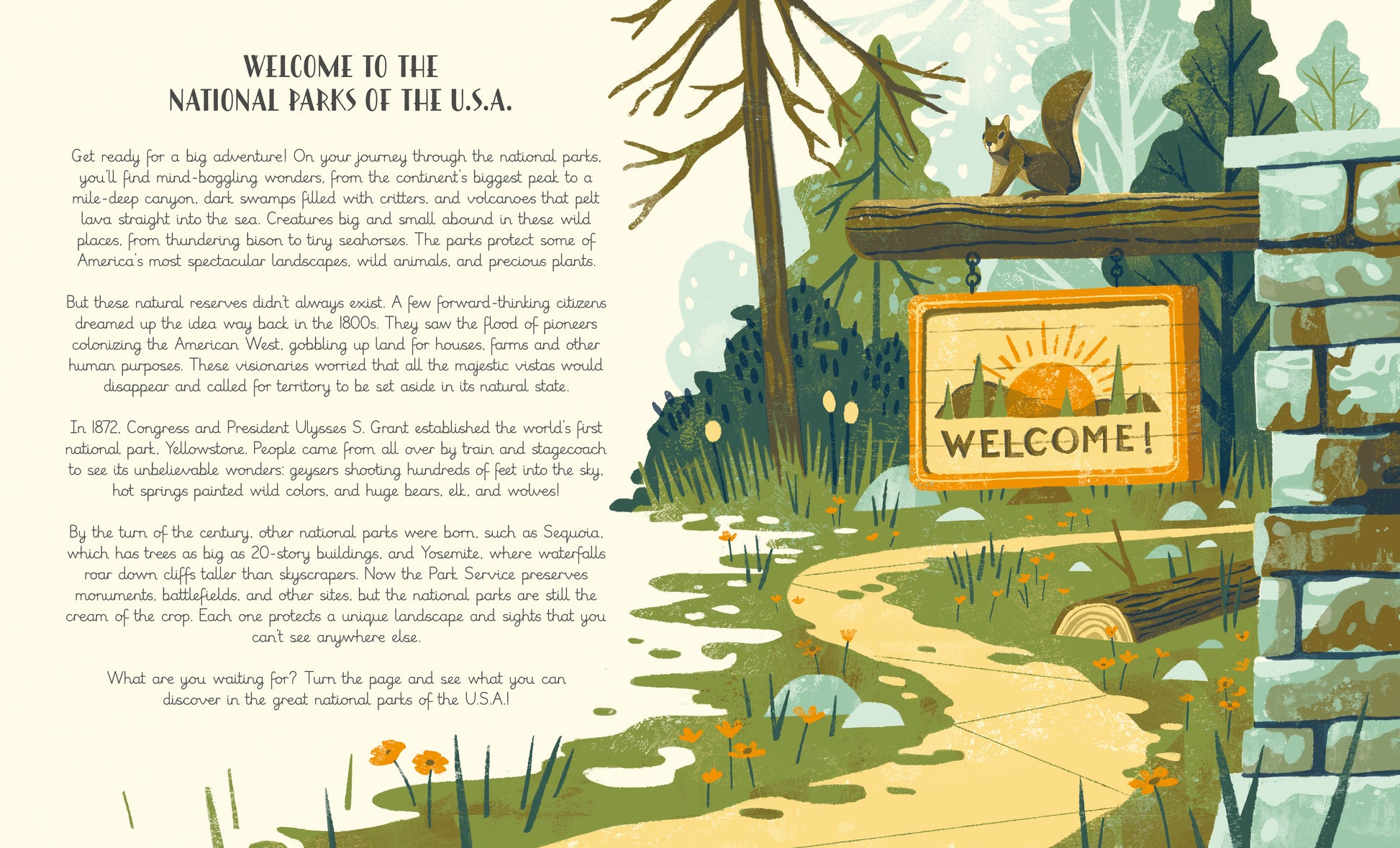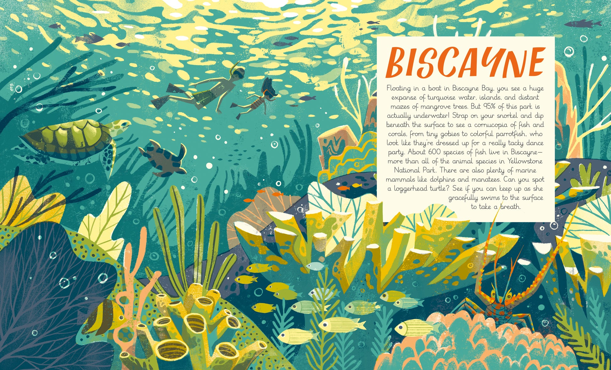 Divided by region (East, Central, Rocky Mountains, West, Tropics and Alaska), a pictographic map at the start of each section shows the locations of the parks to be covered. Each park is introduced by a stunning, poster-worthy illustration of one of its scenes and a summary of its makeup, followed by individual illustrations of the animals and plants that make their homes there.